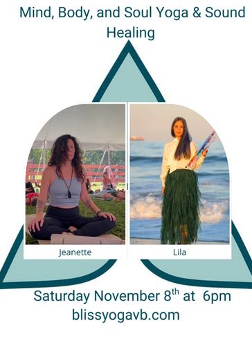 Mind, Body, and Soul Yoga & Sound Healing with Jeanette & Lila! This is a beautiful collaboration that has manifested during this time for you! This is a $40 investment. If you are interested in attending but pricing is an issue, please reach out. We want everyone who needs this offering to be able to attend. Please email info@blissyogavb.com