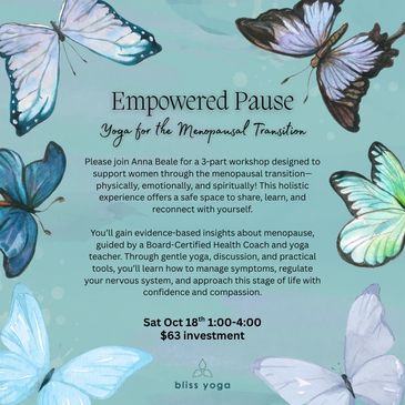 Please join us in welcoming Anna Beale as she leads a special workshop, Empowered Pause: Yoga for the Menopausal Transition. This will take place on Saturday October 18th from 1:00-4:00 pm. This 3-part workshop is designed to support women through the menopausal transition—physically, emotionally, and spiritually! This holistic experience offers a safe space to share, learn, and reconnect with yourself. You’ll gain evidence-based insights about menopause, guided by a Board-Certified Health Coach and yoga teacher. Through gentle yoga, discussion, and practical tools, you’ll learn how to manage symptoms, regulate your nervous system, and approach this stage of life with confidence and compassion. Please click below for Anna's full bio and more details. Register today: https://www.wellnessliving.com/rs/event/blissyogavb?k_class=829912