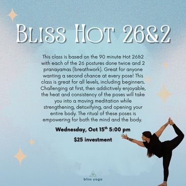 Hot 26ers, we’re back with another 90 minute class! This class will take place on Wednesday 10/15 at 5:00 pm. Join Jen as she guides you through this 90-minute Hot 26&2 with each of the 26 postures done twice and 2 pranayamas (breathwork). Great for anyone wanting a second chance at every pose! This class is great for all levels, including beginners. Challenging at first, then addictively enjoyable, the heat and consistency of the poses will take you into a moving meditation while strengthening, detoxifying, and opening your entire body. The ritual of these poses is empowering for both the mind and the body. Register today: https://www.wellnessliving.com/rs/event/blissyogavb?k_class=585845